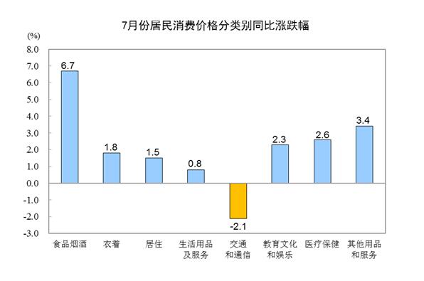 7月份,食品煙酒價格同比上漲6.7%,影響CPI(居民消費價格指數(shù))上漲約1.95個百分點。其中,鮮果價格上漲39.1%,影響CPI上漲約0.63個百分點;畜肉類價格上漲18.2%,影響CPI上漲約0.75個百分點(豬肉價格上漲27.0%,影響CPI上漲約0.59個百分點);雞蛋價格上漲11.4%,影響CPI上漲約0.06個百分點;禽肉類價格上漲7.6%,影響CPI上漲約0.09個百分點;鮮菜價格上漲5.2%,影響CPI上漲約0.12個百分點;糧食價格上漲0.6%,影響CPI上漲約0.01個百分點。