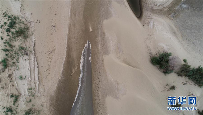 這是2019年實(shí)施的第20次向塔里木河下游生態(tài)輸水,水流在干涸的河床前行(8月25日無人機(jī)拍攝)。 新華社記者 阿曼 攝