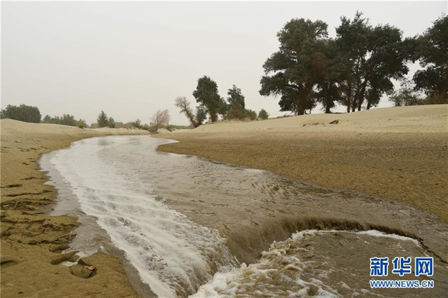 生態(tài)水流過干涸的河床,滋養(yǎng)著兩岸的胡楊(8月25日攝)。 新華社記者 阿曼 攝