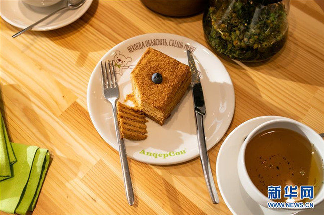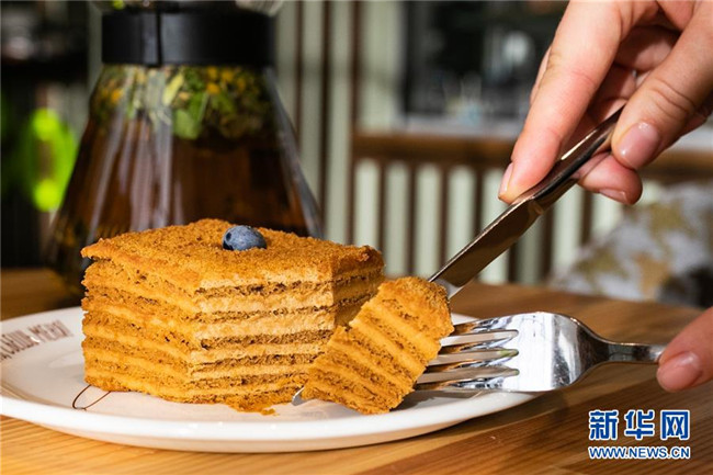 這是8月28日在俄羅斯首都莫斯科的一家咖啡廳內(nèi)拍攝的俄式蜂蜜蛋糕。新華社記者 白雪騏 攝