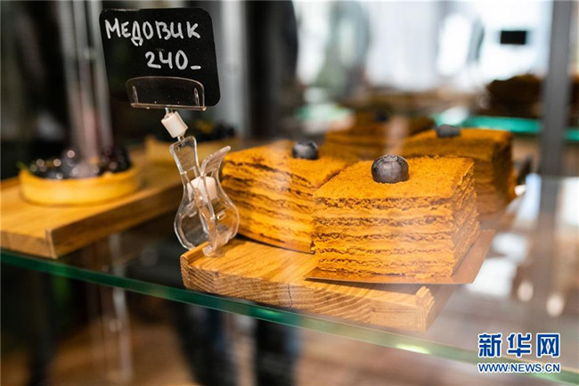 這是8月28日在俄羅斯首都莫斯科的一家咖啡廳內(nèi)拍攝的待售的俄式蜂蜜蛋糕。 新華社記者 白雪騏 攝