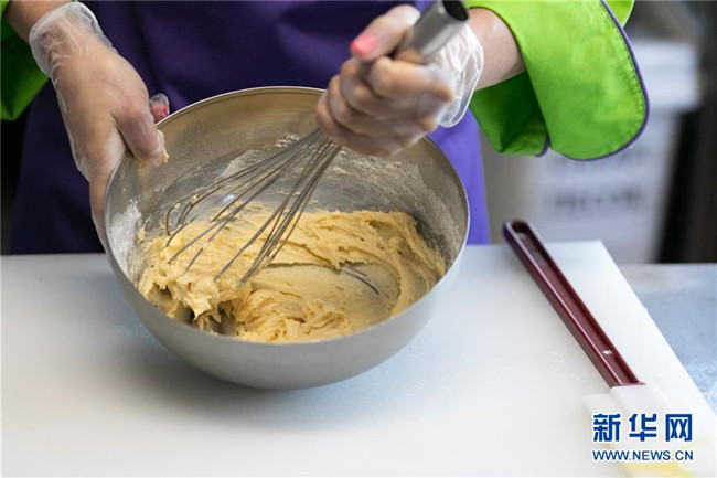 8月28日,在俄羅斯首都莫斯科,糕點(diǎn)師尤利婭將原料攪勻。 新華社記者 白雪騏 攝