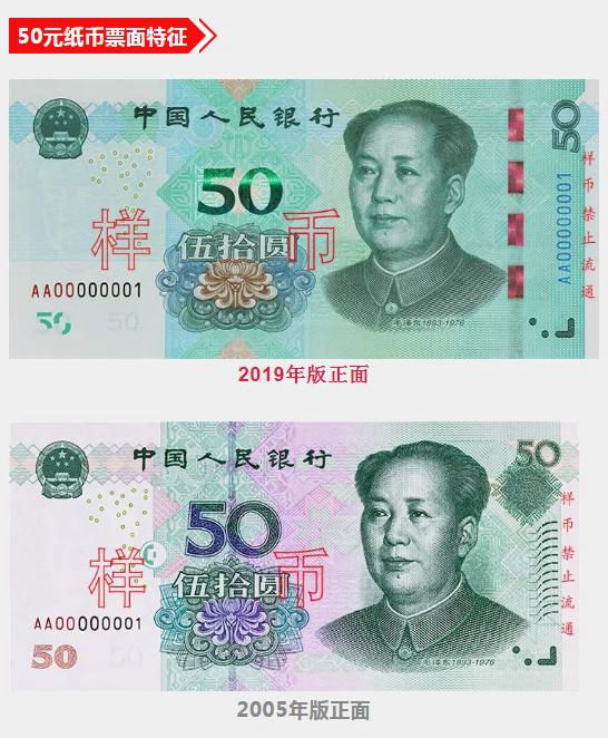 央行介紹,2019年版第五套人民幣50元、20元、10元、1元紙幣分別保持2005年版第五套人民幣50元、20元、10元紙幣和1999年版第五套人民幣1元紙幣規(guī)格、主圖案、主色調(diào)、“中國(guó)人民銀行”行名、國(guó)徽、盲文面額標(biāo)記、漢語(yǔ)拼音行名、民族文字等要素不變,提高了票面色彩鮮亮度,優(yōu)化了票面結(jié)構(gòu)層次與效果。