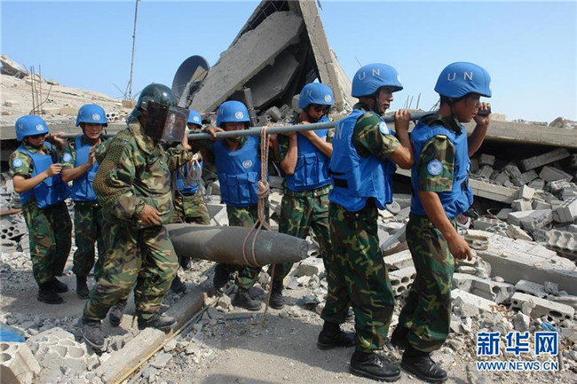 這張未注明拍攝日期的資料照片顯示的是中國(guó)維和部隊(duì)官兵在黎巴嫩南部轉(zhuǎn)移未爆航彈。 新華社發(fā)