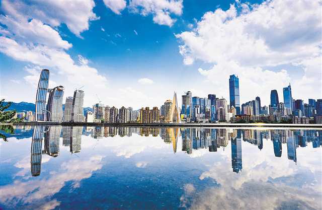 九月十一日,倒映水中的藍天白云和渝中半島。特約攝影 鐘志兵