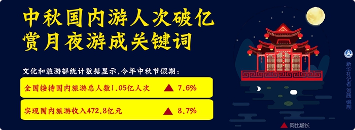 文化和旅游部統(tǒng)計數據顯示,今年中秋節(jié)假期,全國接待國內旅游總人數1.05億人次,同比增長7.6%;實現國內旅游收入472.8億元,同比增長8.7%。