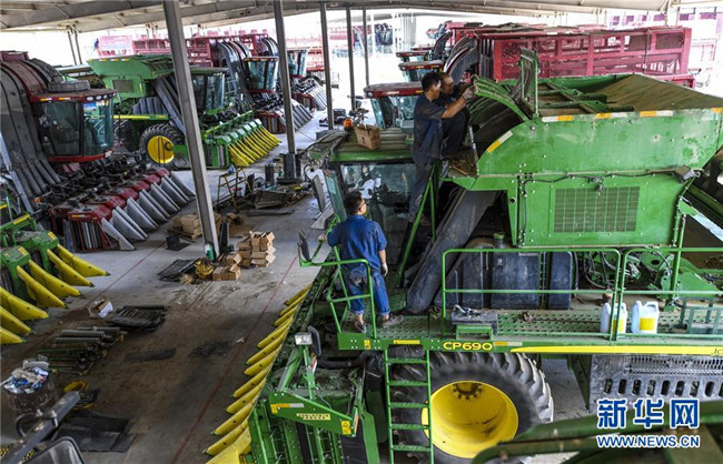 在位于新疆生產(chǎn)建設(shè)兵團(tuán)第六師五家渠市的新疆準(zhǔn)噶爾銀豐農(nóng)機裝備有限公司內(nèi),檢修人員在檢修保養(yǎng)采棉機(7月31日攝)。 新華社記者 王菲 攝