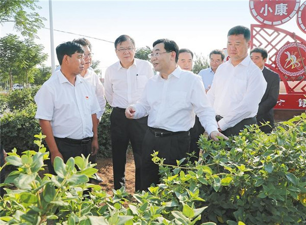 9月25日,省委書記胡和平來到蒲城縣堯山鎮(zhèn)閆家村金銀花現(xiàn)代農(nóng)業(yè)園區(qū),察看金銀花長勢(shì),了解畝產(chǎn)、收益和帶動(dòng)脫貧致富效果。記者 宋紅梅攝