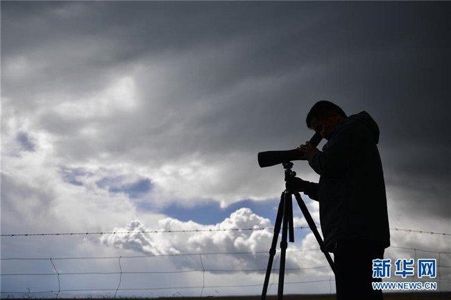 9月23日,青海湖國家級自然保護區(qū)管理局的巡湖觀測人員楊濤在青海湖畔的尕日拉村觀測點進行觀測。