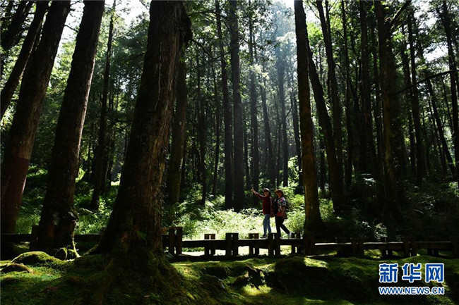 10月7日,游客在阿里山的樹(shù)林中游覽。