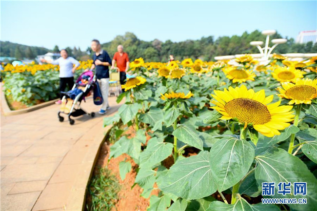 近日,位于長沙市的湖南省森林植物園中的向日葵在秋陽下競相綻放,黃花綠葉交相輝映,吸引眾多市民、游客前來觀賞。