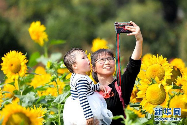10月10日,家長和孩子在湖南省森林植物園的向日葵花海中自拍。新華社記者 陳澤國 攝