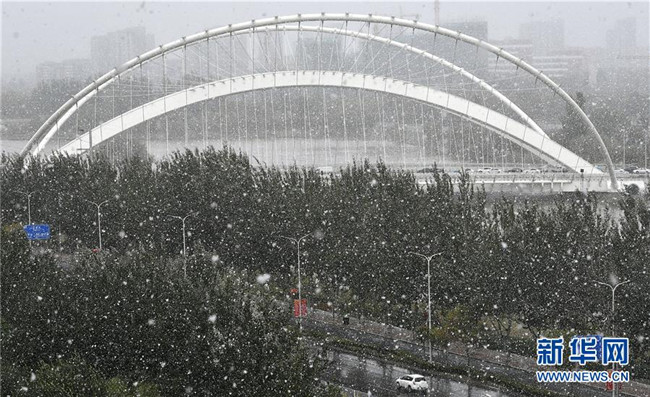 這是在銀川市街頭拍攝的雪景(10月14日攝)。當(dāng)日,寧夏銀川市迎來降雪天氣。寧夏氣象臺發(fā)布暴雪藍(lán)色預(yù)警,提醒市民注意交通安全、做好防寒、防滑和清雪工作。新華社記者王鵬攝