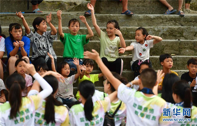 黔桂烏英苗寨的孩子們?cè)诎拈T志愿者的指導(dǎo)下練習(xí)表演(8月10日攝)。