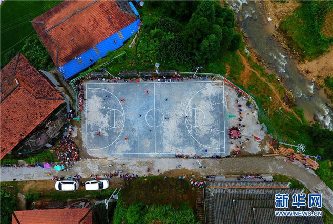 黔桂烏英苗寨的群眾在打籃球(7月19日無(wú)人機(jī)拍攝)。