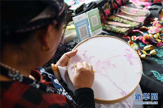 10月16日,團結村的一名“巧媳婦”在刺繡。 新華社記者 楊宗友 攝