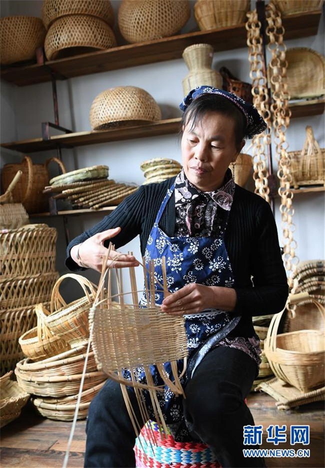 10月16日,團結村的“巧媳婦”袁悅花在編織竹制家庭用具。 新華社記者 楊宗友 攝