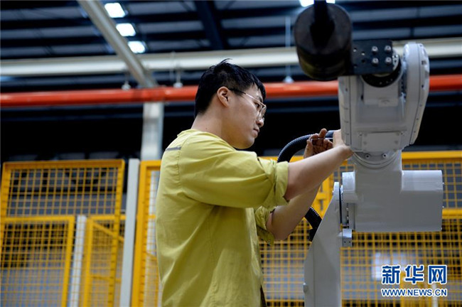 在蕪湖機器人產(chǎn)業(yè)園,工作人員在預裝埃夫特六關節(jié)機器人零部件(10月21日攝)。 新華社發(fā)(黃博涵攝)
