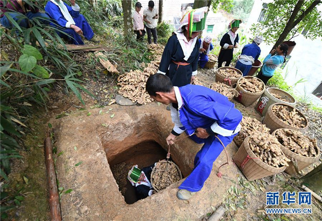 11月12日,廣西賀州市平桂區(qū)鵝塘鎮(zhèn)槽碓村和土瑤群眾將剛剛收獲的大肉姜放入地窖儲(chǔ)存。
