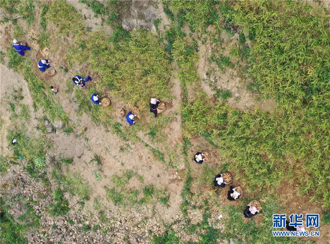 11月12日,廣西賀州市平桂區(qū)鵝塘鎮(zhèn)槽碓村的土瑤群眾在收獲大肉姜(無(wú)人機(jī)拍攝)。
