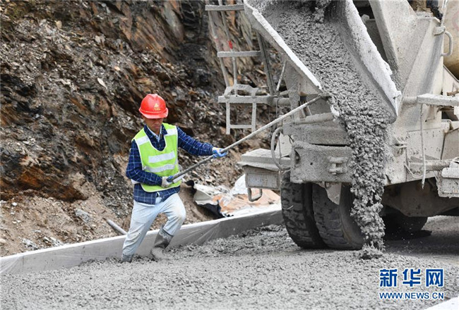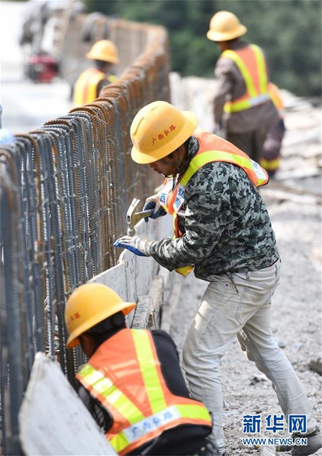 11月19日,在廣西融水苗族自治縣四榮鄉(xiāng),工人在羅融二級公路建設現(xiàn)場施工。 新華社記者 黃孝邦 攝