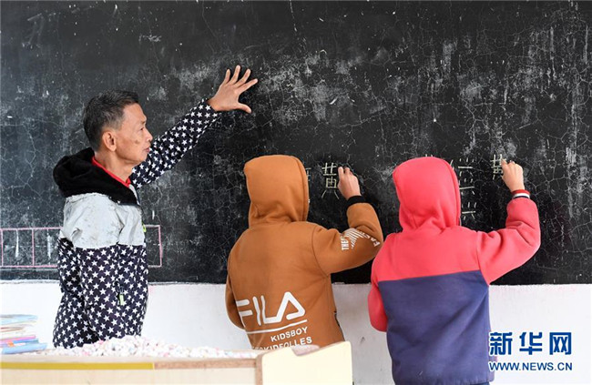11月19日,在廣西上思縣那琴鄉(xiāng)中心小學(xué)逢通村教學(xué)點(diǎn),梁志雄教兩名學(xué)生寫字。新華社記者陸波岸攝
