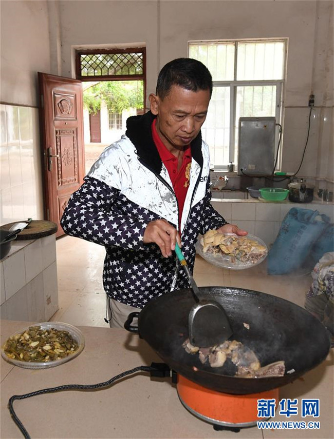 11月19日,在廣西上思縣那琴鄉(xiāng)中心小學(xué)逢通村教學(xué)點(diǎn),梁志雄在給學(xué)生做午飯。新華社記者陸波岸攝