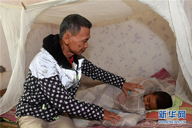 11月19日,在廣西上思縣那琴鄉(xiāng)中心小學(xué)逢通村教學(xué)點(diǎn),梁志雄在照顧一名學(xué)生午休。新華社記者陸波岸攝