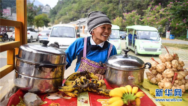這是廣西凌云縣浩坤村群眾在景區(qū)擺放水果等食品接待游客(11月24日攝)。新華社記者張愛(ài)林