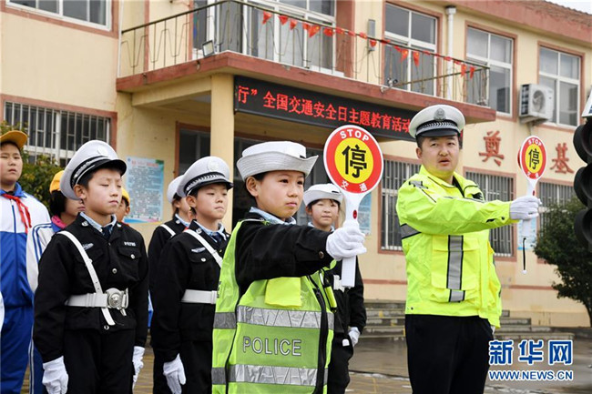 12月1日,東皋埠小學(xué)“小小交警隊(duì)”的隊(duì)員在學(xué)習(xí)交通指示手勢(shì)。新華社記者 李紫恒攝