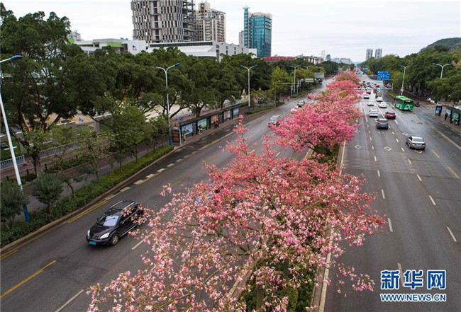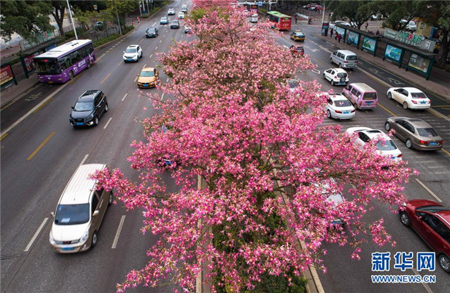 初冬時節(jié),廣西柳州市區(qū)東環(huán)大道、桂柳路等多條道路旁的1萬多株美麗異木棉進入花期,競相綻放的紅色花朵將城市裝扮得格外美麗。 近年來,廣西柳州對城市進行花化、彩化、香化,著力打造生態(tài)花園城市景觀。