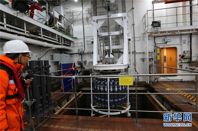 12月9日,科考隊(duì)員首次利用“雪龍2”號(hào)月池系統(tǒng)進(jìn)行CTD采水作業(yè)。 新華社記者 劉詩平 攝