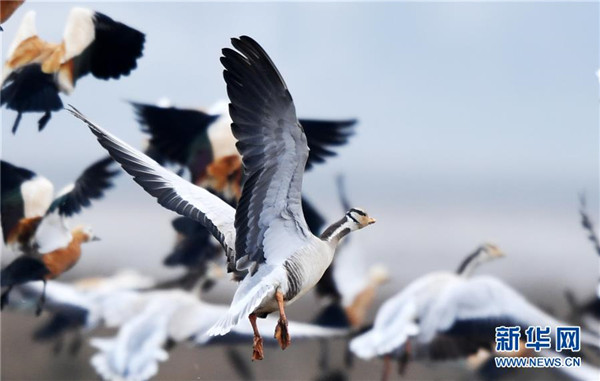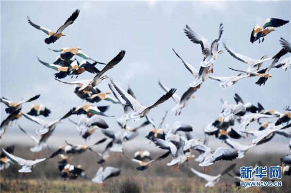 12月11日在貴州草海保護(hù)區(qū)拍攝的越冬的斑頭雁和赤麻鴨。新華社記者楊文斌攝