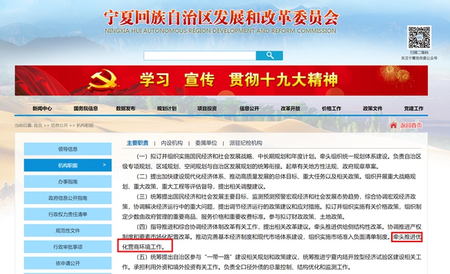 在自治區(qū)發(fā)改委官方網(wǎng)站上,其機(jī)構(gòu)職能中主要職責(zé)提到負(fù)責(zé)牽頭推進(jìn)優(yōu)化營(yíng)商環(huán)境工作。(網(wǎng)頁(yè)截圖)