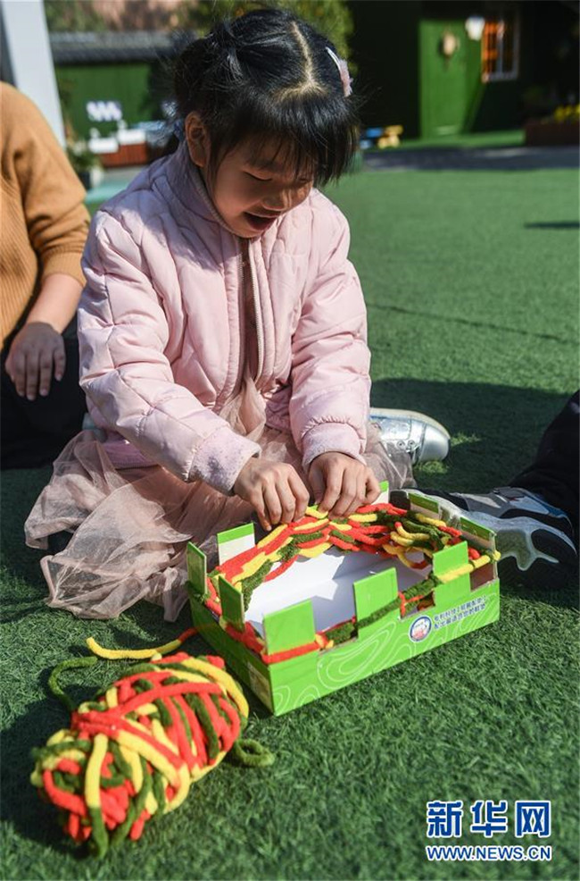 12月11日,小朋友用紙盒制作的工具編織愛(ài)心圍巾。 新華社記者 徐昱 攝
