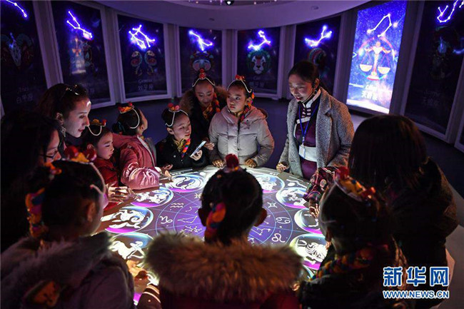 12月14日,拉薩市實(shí)驗(yàn)小學(xué)學(xué)生在藏域星球天文科普體驗(yàn)館學(xué)習(xí)星座知識。當(dāng)日,藏域星球天文科普體驗(yàn)館在西藏拉薩開館試運(yùn)營,這是西藏第一家天文科普體驗(yàn)館。據(jù)介紹,此館以感知宇宙、認(rèn)知宇宙、探索宇宙為主題,以參觀者的第一感官體驗(yàn)為設(shè)計(jì)導(dǎo)向,利用互動投影、懸浮投影、物體跟蹤、人體捕捉、體感互動、VR等高科技手段展示藏地的神秘,揭示宇宙的奧秘。新華社記者李鑫攝