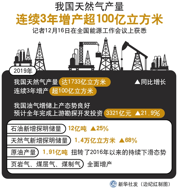 2019年,我國天然氣產(chǎn)量達(dá)1733億立方米,連續(xù)3年增產(chǎn)超100億立方米。