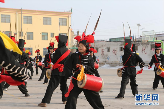 攻鼓子是發(fā)源于甘肅武威的一種民間鼓樂舞蹈,表演風格渾厚豪邁、威武雄壯,具有強烈的地域特色。2008年,涼州攻鼓子被列為第二批國家級非物質文化遺產。為更好地傳承這項非物質文化遺產,甘肅省武威市涼州區(qū)四壩鎮(zhèn)九年制學校組建攻鼓子藝術社團,開設攻鼓子校本課,定期由當?shù)毓ス淖哟硇詡鞒腥藢W生進行指導,推動“非遺”攻鼓子藝術教育普及。 新華社記者 耿馨寧 攝
