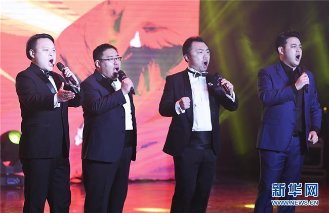 1月12日,中央歌劇院文藝小分隊(duì)志愿者在慰問(wèn)演出上表演男聲四重唱。新華社記者 王全超 攝