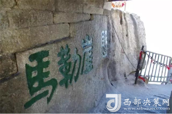 華山長空棧道上下皆是懸崖絕壁,鐵索橫懸,由條石搭成尺許路面,下由石柱固定。由于棧道險(xiǎn)峻,故當(dāng)?shù)厝擞?ldquo;小心九厘三分,要尋尸首,洛南商州”之說。這里只是探險(xiǎn)之道,并非登山必由之路,膽小人就在升表臺看看也就行了。所以在長空棧道的入口處,就有這樣一塊石刻,上邊刻著“懸崖勒馬”四個(gè)大字。懸崖勒馬的字面意思就是說在高高的山崖邊上勒住馬。比喻到了危險(xiǎn)的邊緣及時(shí)清醒回頭。面對長空棧道這樣險(xiǎn)峻的地勢,游人確實(shí)要比正常情況下更加清醒。