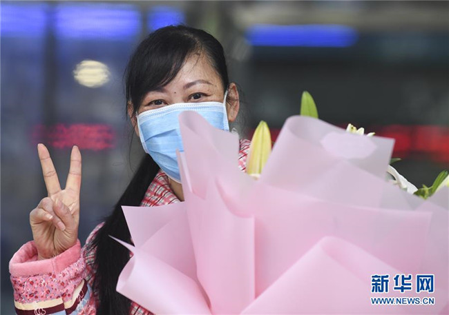 1月29日,在重慶三峽中心醫(yī)院,治愈患者蔣某的家屬(右)向主管護(hù)士送花表示感謝。 新華社記者王全超攝+