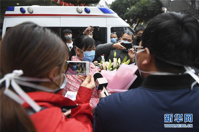 1月29日,在重慶三峽中心醫(yī)院,主管醫(yī)生向治愈患者蔣某送花表示祝賀。 新華社記者王全超攝