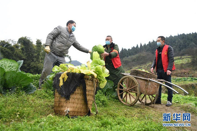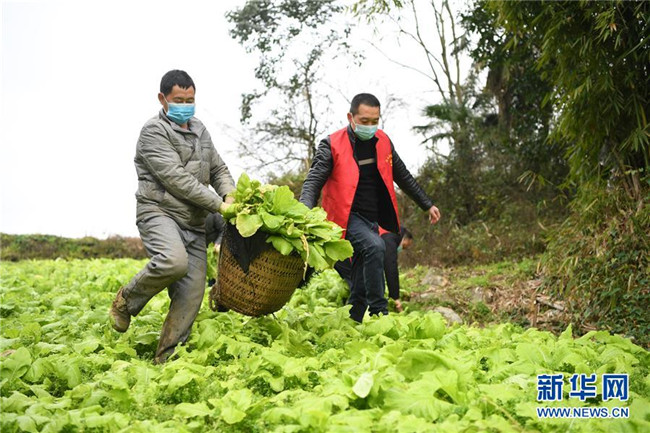 2月8日,菜農(左)和鄉(xiāng)村蔬菜配送小隊志愿者在搬運蔬菜。 新華社記者 唐奕 攝
