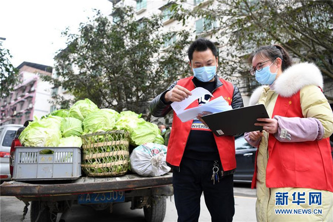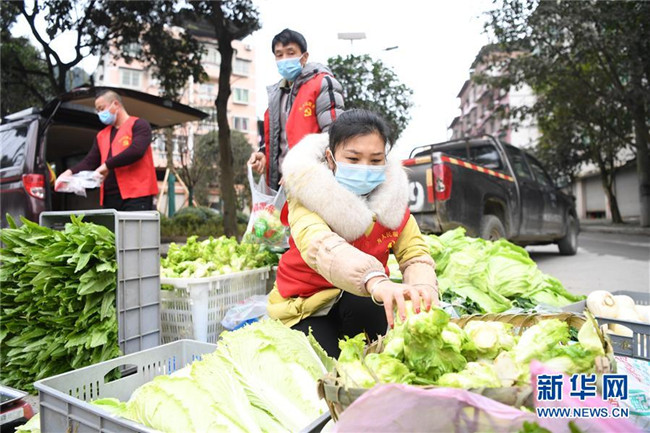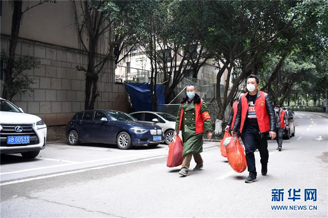 2月8日,詹成偉(前右)和志愿者準備將新鮮蔬菜送至小區(qū)。 新華社記者 唐奕 攝