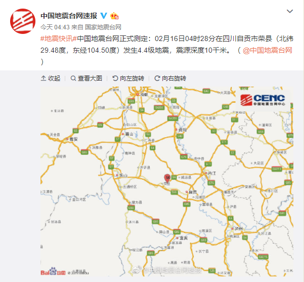 四川自貢市榮縣發(fā)生4.4級地震 震源深度10千米