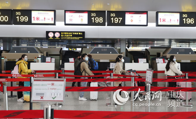 隨著旅客返程復(fù)工增多,重慶機場為最大限度減少人員聚集,通過自助值機、無紙化值機縮短旅客在候機樓停留時間同時,引導(dǎo)旅客在值機、安檢、登機排隊時,都保持1米以上的安全防護距離。