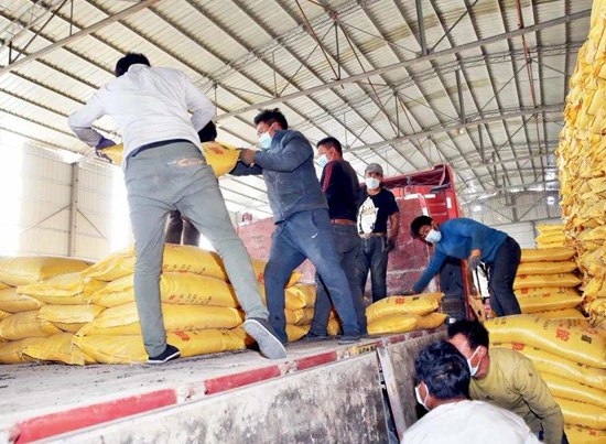 西藏農投集團化肥倉庫現有庫存2萬多噸化肥,工人們正在忙碌搬運。西藏日報記者 姚海全 攝