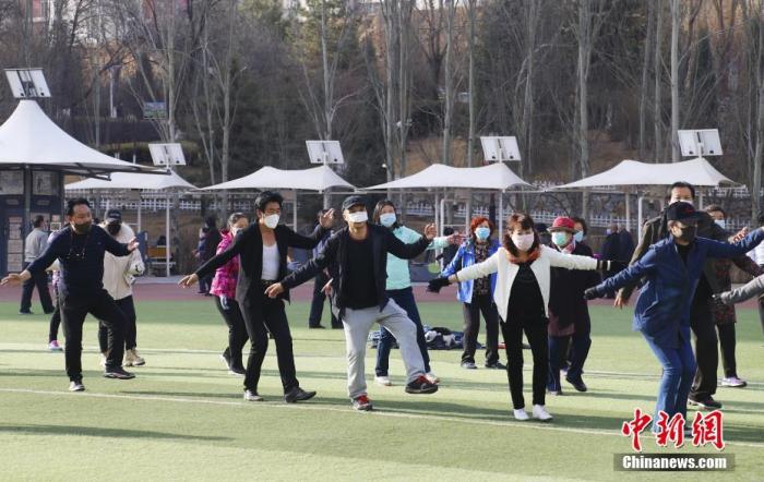 資料圖:3月20日,西寧市戶外體育場(chǎng)所已全部開放,市民在體育場(chǎng)上跳起鍋莊。 中新社記者 馬銘言 攝