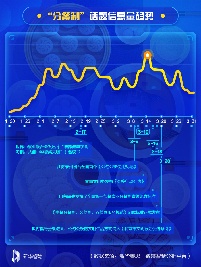 根據(jù)新華睿思·數(shù)媒智慧分析平臺數(shù)據(jù)顯示,在最近兩個月來,關(guān)于分餐制話題的關(guān)注度不斷上升,全國范圍內(nèi)信息量累計達(dá)到1039539條。其中,從話題趨勢演變圖看,3月14日達(dá)到輿論熱度的首個峰值(30183條),這與北京、江蘇泰州等地發(fā)布出臺關(guān)于公筷使用的文件直接相關(guān)。