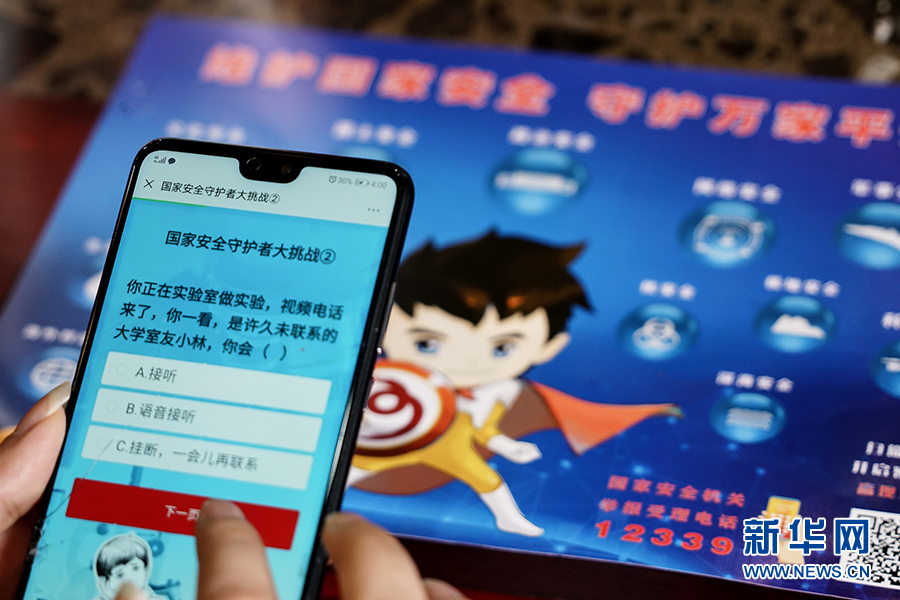 這一游戲程序把“國(guó)家安全進(jìn)網(wǎng)絡(luò)”和“國(guó)家安全進(jìn)課堂”相結(jié)合,測(cè)試內(nèi)容集知識(shí)性和趣味性于一體,把國(guó)家安全大政方針與人民群眾生產(chǎn)生活可能遇見的風(fēng)險(xiǎn)情況有機(jī)結(jié)合,以號(hào)召?gòu)V大人民群眾積極參與到國(guó)家安全中來,把國(guó)家安全群眾性教育落實(shí)落地。新華網(wǎng) 韓夢(mèng)霖 攝